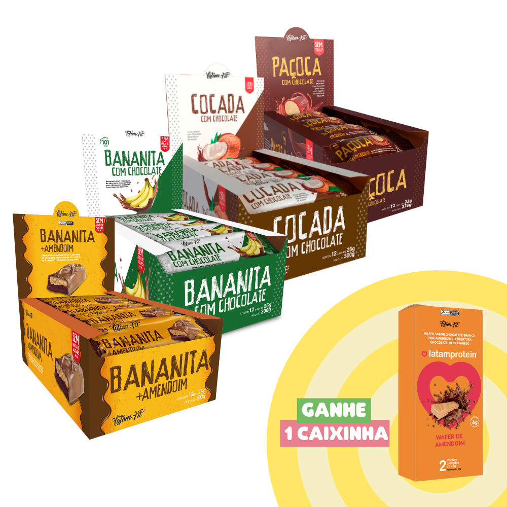 Desfrute do sabor do chocolate em cada pedaço! Com o Choco Combo da Latam.fit, você pode saborear barras de chocolate deliciosas, incluindo bananinha, cocada paçoca e bananinha com amendoim. Uma verdadeira variedade de sabores de chocolate.